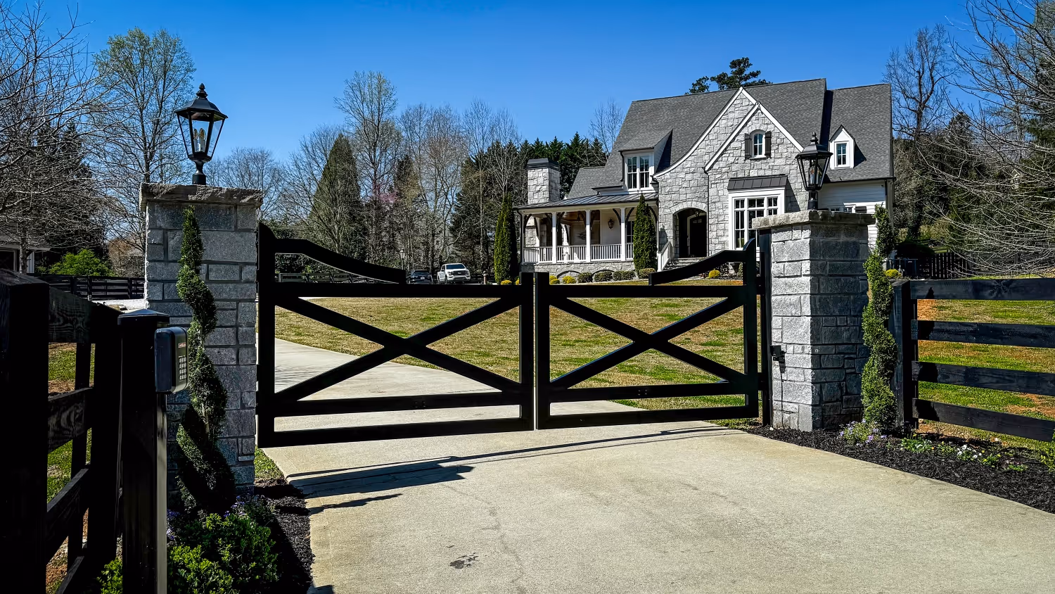 We integrate fencing with custom fabricated steel gates and premium stone or brick columns to create a complete, cohesive entrance system. Each component is designed to match your home’s architecture and acreage.